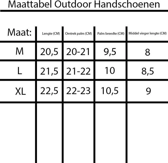 Daarnaast zorgt de stof voor het gemakkelijk bedienen van een smartphone en zijn ze eenvoudig om- en af te doen met klittenband. Een richtlijn van de verschillende maten is af te leiden uit de maattabel. Echter zullen de handschoenen tijdens het dragen naar de handen vormen.
