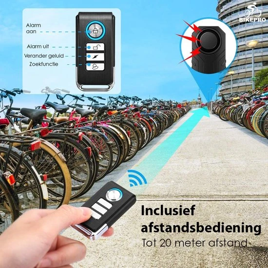 De BikePro fietsbeveiligingsalarm draadloze bediening op afstand, sterk draadloos bereik tot 20M. Voertuigzoekfunctie, gemakkelijk om uw voertuigen op de parkeerplaats te vinden, 3 soorten bellen naar keuze (niet beschikbaar in ARM-modus).