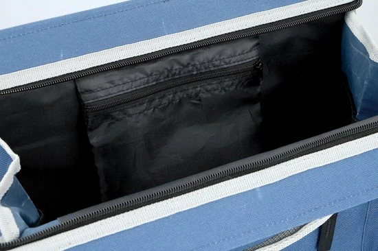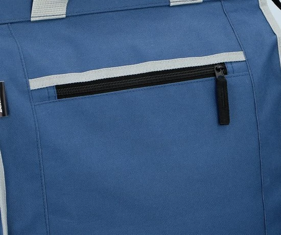 De tas zelf is blauw en gemaakt van stevig waterdicht polyester. Hij is afgebiesd in het grijs en heeft ook een grijs handvat. Aan beide zijkanten is een reflecterende striping voorzien voor extra veiligheid.