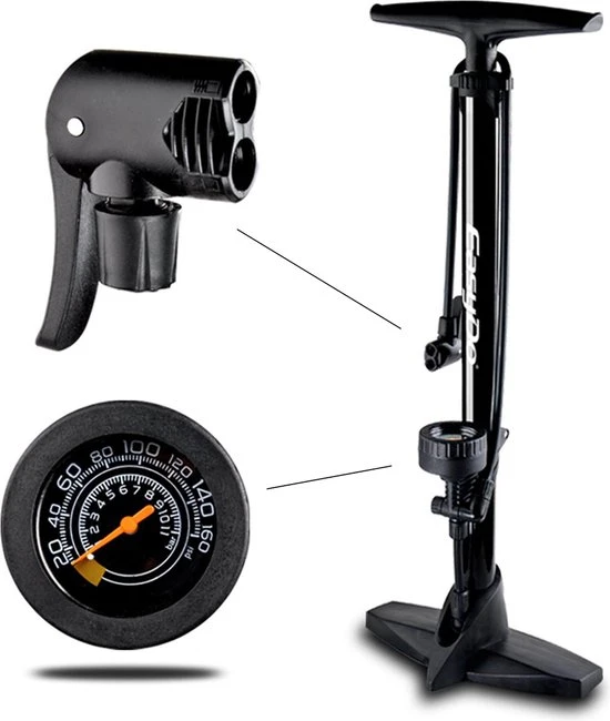 Matzwarte aluminium fietspomp met drukmeter Γ©n extra ventielen voor elk type fiets, andere voertuigen en banden zoals autobanden en scooterbanden, maar ook als ballenpomp. 800 gr. Lichtgewicht frame, extra lange buigbare en flexibele luchtslang voor optimale luchtdoorstroom. Krachten besparend ergonomische handvat i.c.m. de stabiliteit van deze pomp sta jij, en je spullen, nooit meer met lege handen.