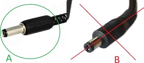 Dit valt te zien op de kop van de connector, zie plaatje A de 2.5mm (deze lader) of plaatje B de gangbare 2.1mm.