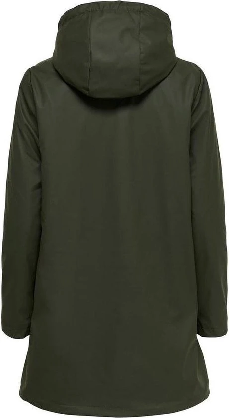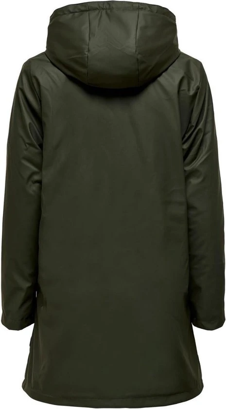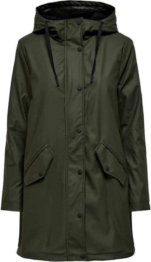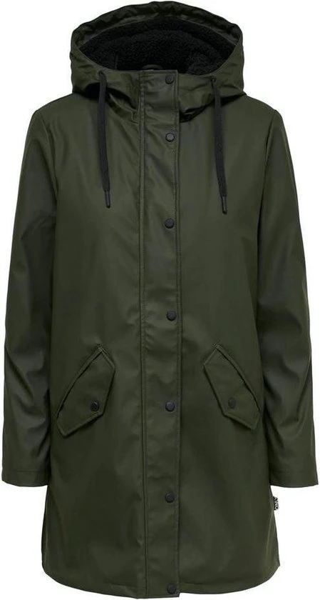 Halflange regenjas van Only met vaste capuchon. De jas sluit doormiddel van een rits en heeft een flap met drukknopen om de wind en regen tegen te houden. Dit model heeft twee klepzakken aan de voorkant en twee ventilatiegaatjes onder de oksel. Het voor- en achterpand is voorzien van een heerlijke teddy voering.