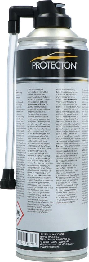 Protecton bandenreparatie is een spray voor het uitvoeren van noodreparaties aan tubeless banden. Gebruiksvriendelijke spray, op basis van rubber, dicht kleine lekkages in het loopvlak van de band. Te gebruiken zonder demontage van de band. Inhoud 500ml.