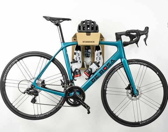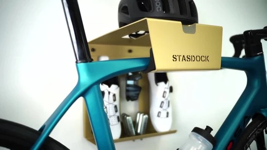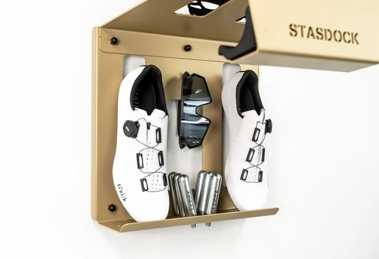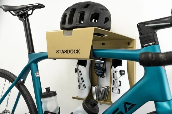 De Stasdock is een krachtige en stijlvolle fiets muurbeugel voor jouw racefiets of mountainbike en is zo uitgerust dat je er ook fietsaccessoires in kunt opslaan, zoals je schoenen, helm, bril en luchtcapsules.